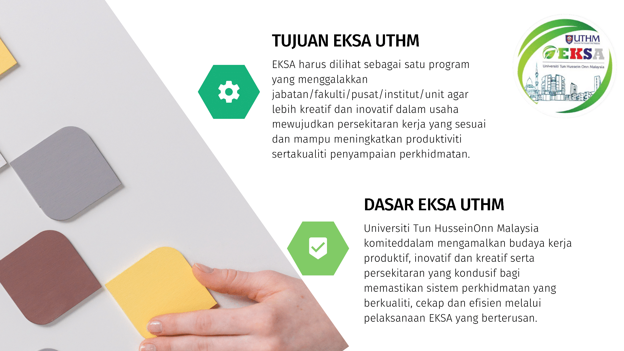 Ekosistem Kondusif Sektor Awam (EKSA) diperkenalkan sebagai penambahbaikan kepada Amalan 5S (Sisih, Susun, Sapu, Seragam, Sentiasa Amal) yang telah diamalkan di Universiti Hussein Onn Malaysia (UTHM) sebelum ini. Pelaksanaan EKSA bagi menggantikan Amalan 5S ini adalah selaras dengan usaha Unit Pemodenan Tadbiran dan Perancangan Pengurusan Malaysia (MAMPU) untuk membentuk identiti institusi yang unik.